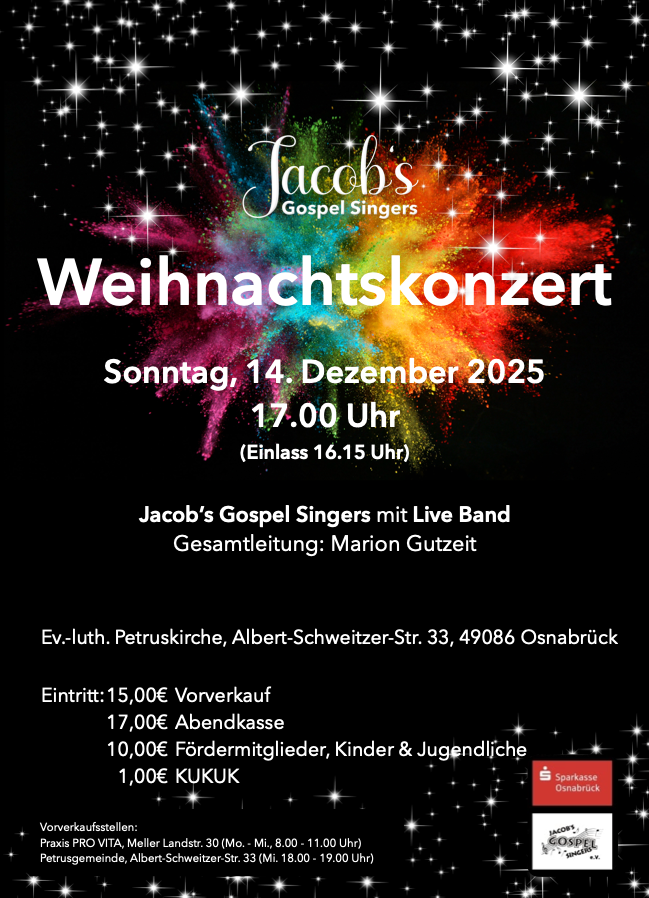 Wir sind die Jacob`s Gospel Singers, ein Gospelchor aus der Apostel-Gesamtkirchengemeinde in Osnabrück.